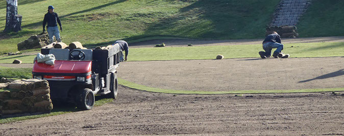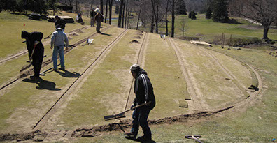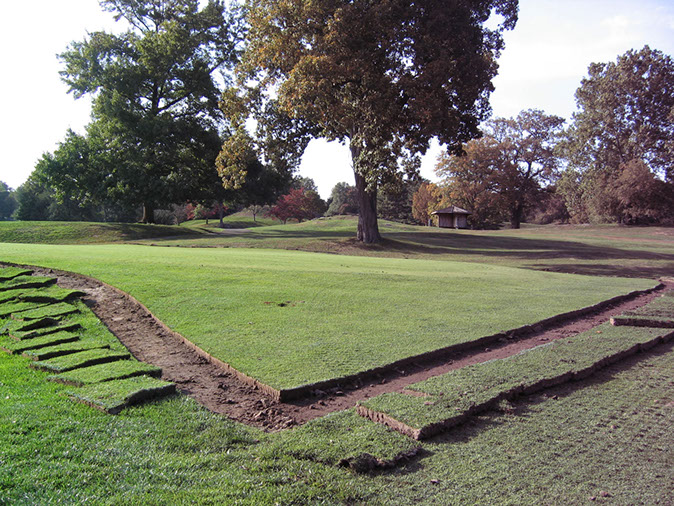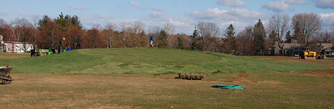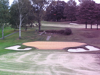 Conversion of predominantly Poa greens to Bentgrass. The process involved deep aerification, topdressing, stripping sod, grooming, adding soil amendments, and finally laying new sod.